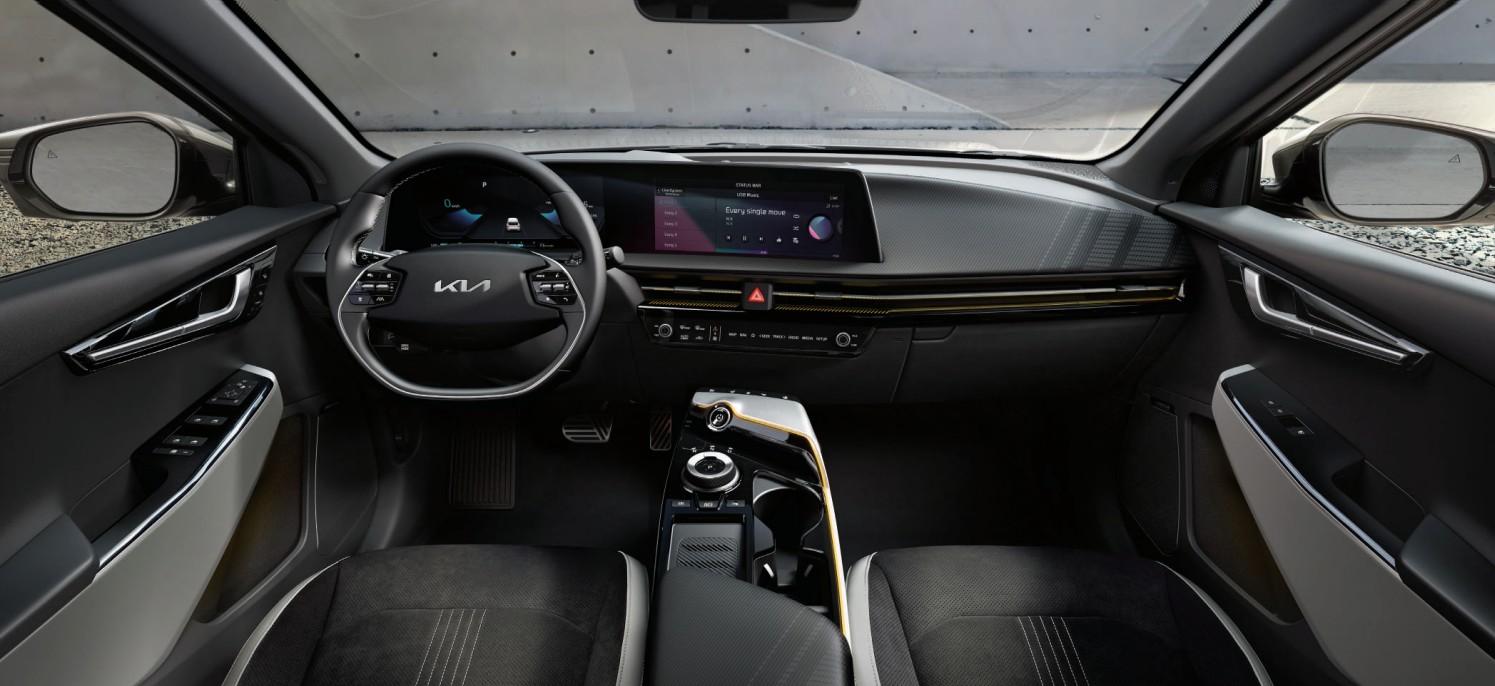 Open the door, and the EV6 feels like a cockpit designed for the modern driver. A minimalist, driver-focused dashboard features dual 12.3-inch screens, one for the digital instrument cluster and the other for infotainment. The curved layout seamlessly blends into the center console, giving the cabin a premium, futuristic feel.