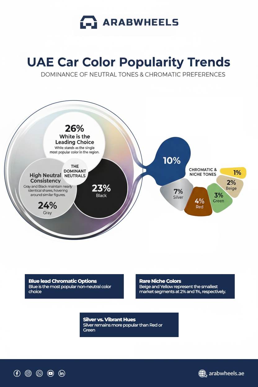 Buying a white or black vehicle remains a practical choice, especially in hot climates like Dubai, where heat-reflective coatings and light tones improve comfort.