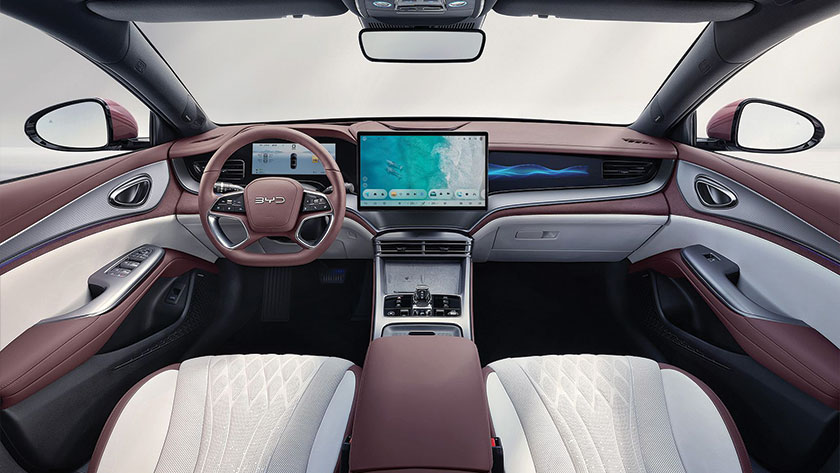 تُعد سيل 7 DM-i من بي واي دي واحدة من أكبر سيارات السيدان الهجينة القابلة للشحن في فئتها. تم تصميم المقصورة الداخلية مع التركيز على الراحة، حيث تحتوي على مقاعد جلدية مهوّاة وشاشة معلومات وترفيه دوّارة بقياس 15.6 إنش. كما تضيف فتحة السقف البانورامية و13 وسادة هوائية إلى مستويات الفخامة والسلامة التي يتوقعها العملاء من السيارات الكهربائية الفاخرة في السوق.
