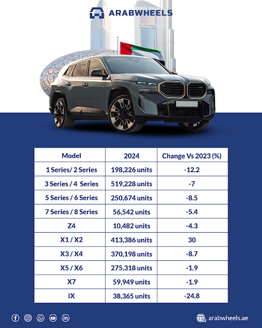احتفظت بي إم دبليو بعرش مبيعاتها الفاخرة العالمية في 2024 على الرغم من انخفاض بنسبة 2.3% ليصل إجمالي المبيعات إلى 2,200,217 وحدة. أما منافسوها فقد حققوا نتائج أقل: فقد انخفضت مبيعات مرسيدس بنسبة 3% لتصل إلى 1,983,403 وحدة، بينما تراجعت مبيعات أودي بنسبة 11.8% لتصل إلى 1,671,218 وحدة. ومع ذلك، شهدت تقريبًا جميع موديلات بي إم دبليو انخفاضات في المبيعات باستثناء موديلين. ومن المفارقات أن أحد هذين الموديلين كان بي إم دبليو XM.