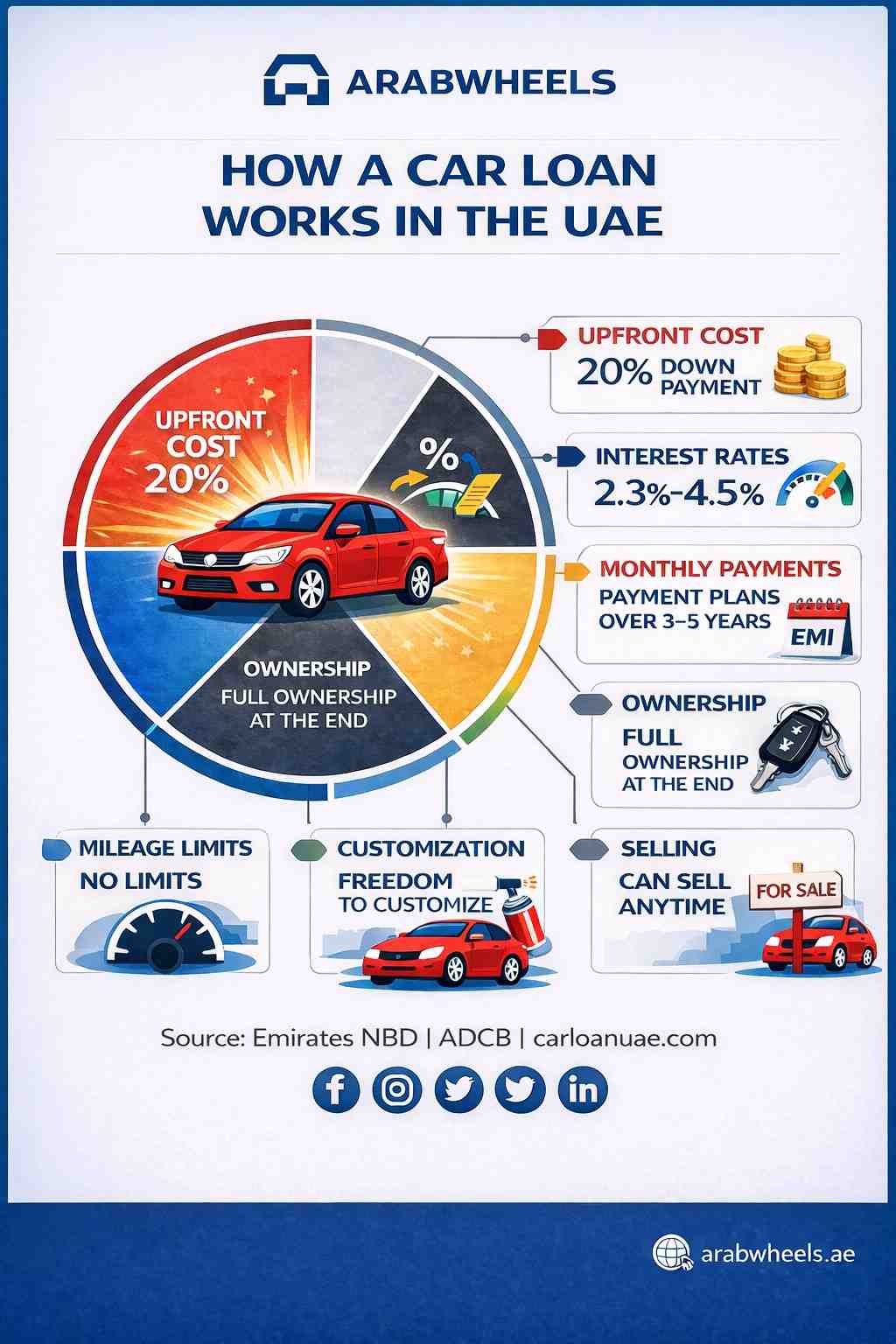 Taking a car loan in the UAE means borrowing money from a bank or finance company to buy the car outright. You pay a down payment (often around 20% of the car’s value), then monthly instalments plus interest over 3–5 years. When the final payment clears, the car is entirely yours.