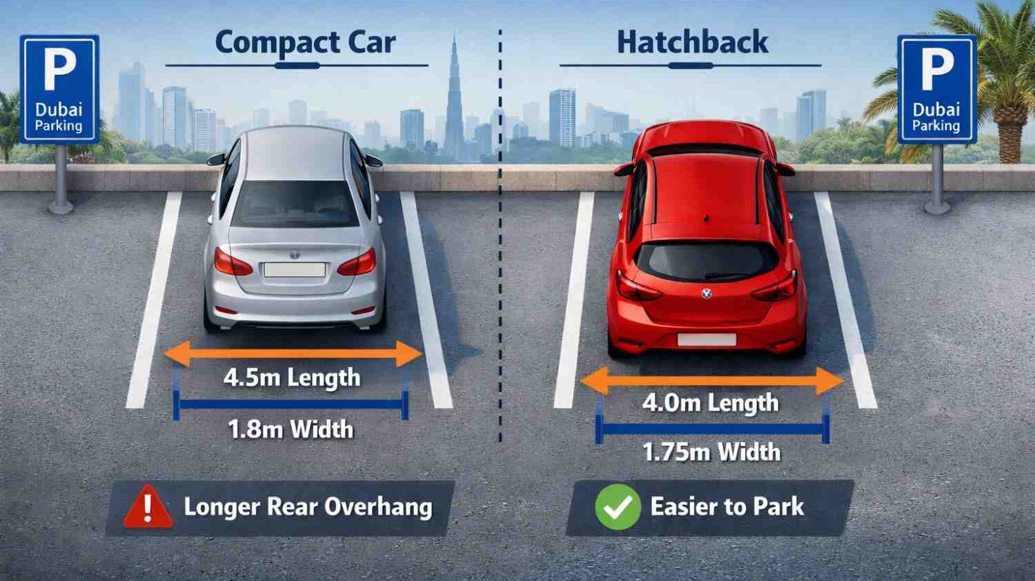 Choosing the wrong car can make everyday driving stressful. The diagram shows a hatchback vs. a compact car in a typical Dubai parking space. The compact car, with a separate trunk, fits neatly but offers limited cargo access. Meanwhile, the hatchback’s flexible rear design makes loading easier and better use of space. This visual demonstrates why understanding the practical differences between compact cars and hatchbacks is essential for city driving.