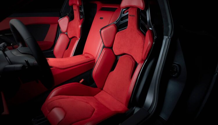 Suspension geometry is carried over directly from the GT3. Only spring rates, damper valving, and anti-roll bars change for public roads. The cockpit layout is pure race: fixed carbon seats, Alcantara everywhere, and a square steering wheel.