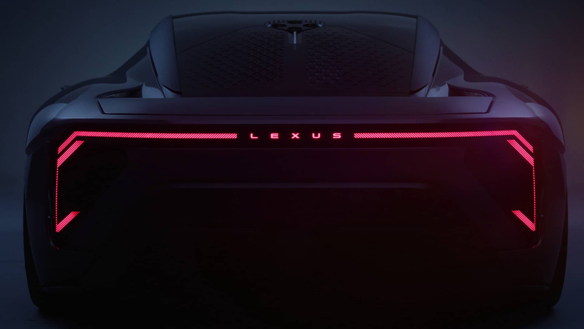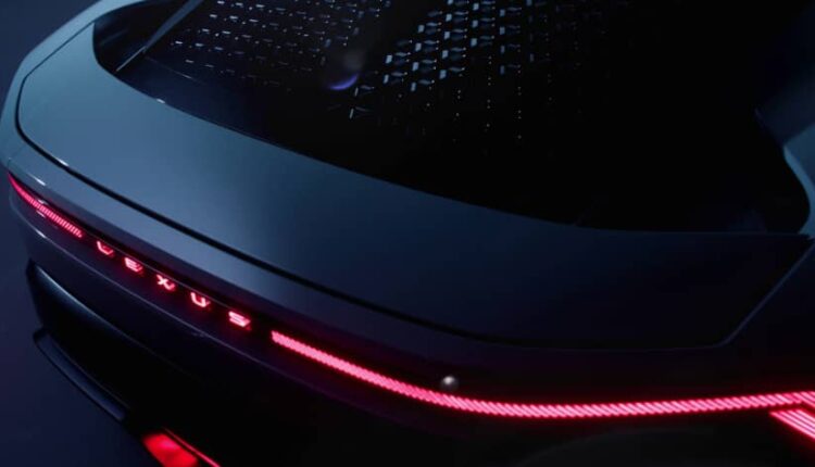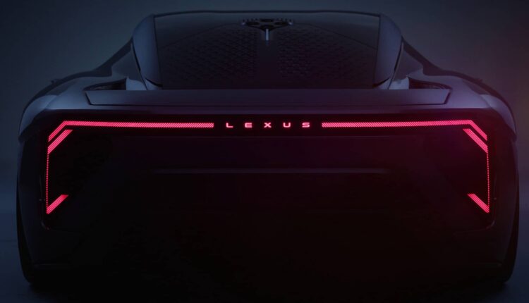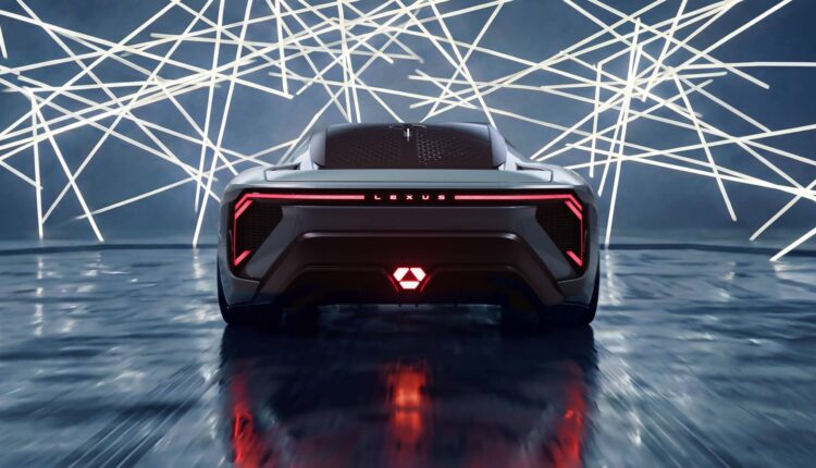 Overall height stays under 1,200 mm despite the solid-state battery pack forming the floor. The front fascia wears the new Lexus spindle executed as a closed, glowing panel. Rear lighting stretches almost bumper-to-bumper.