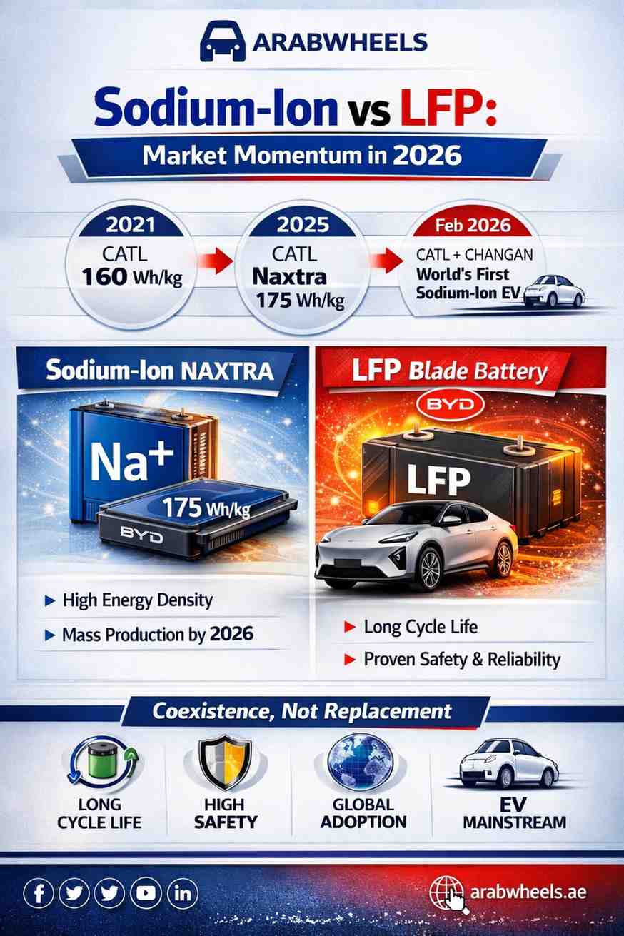 In 2026, LFP still makes more sense for most EV buyers because it is proven, widely deployed, and backed by a mature supply chain. Sodium-ion is the chemistry to watch because it could lower costs, diversify battery sourcing, and open new paths for entry EVs and storage. For ArabWheels readers, that is the real answer to Sodium Ion vs LFP Batteries.