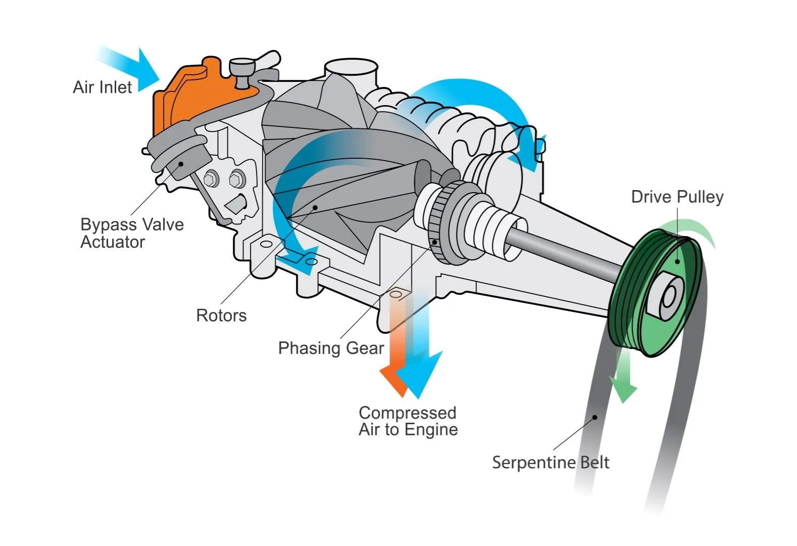 Imagine you’re riding that same bicycle, but this time you have a friend running next to you with an air pump. Every time you pedal, your friend pushes fresh air directly into your lungs through the pump—instantly helping you pedal faster. That’s how a supercharger works. Instead of waiting for exhaust gases like a turbocharger, it’s mechanically connected to the engine’s crankshaft, pushing more air in as soon as you hit the accelerator. The result? Instant power, no delay.